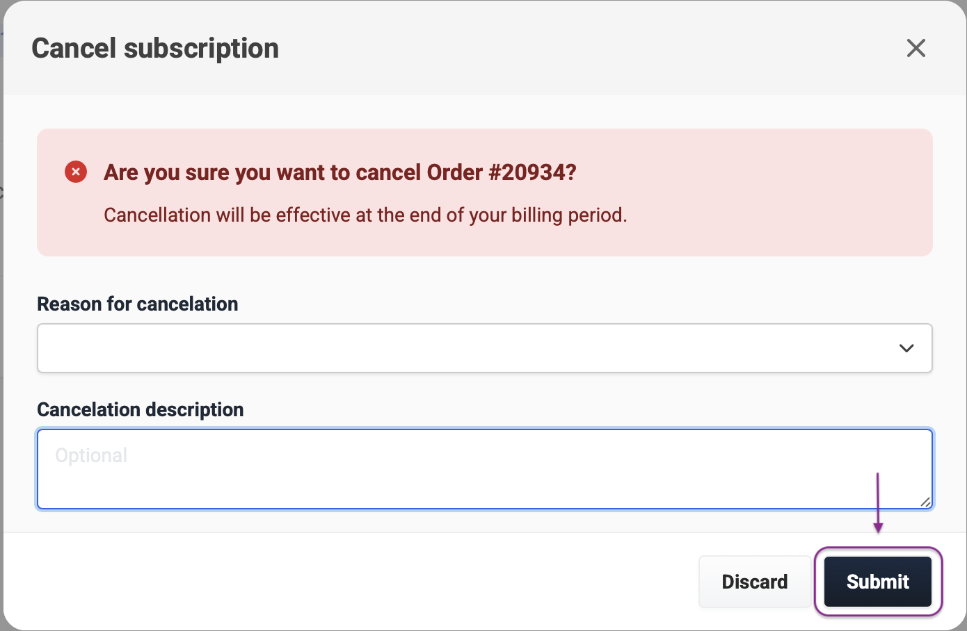 7. Selecciona el motivo de Cancelación y Finaliza pinchando en "Submit"